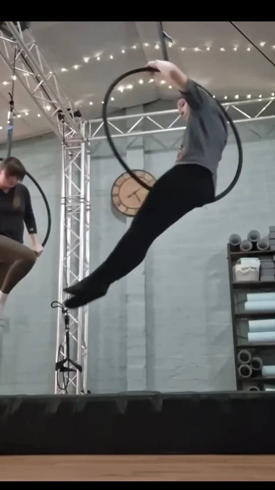 An aerial hoop class is a full body workout that uses a suspended steel hoop (also called a Lyra) to build strength, flexibility, and coordination while performing controlled movements in the air. Students learn poses and tricks in and around the hoop, developing core and upper-body strength in a fun, supportive environment.